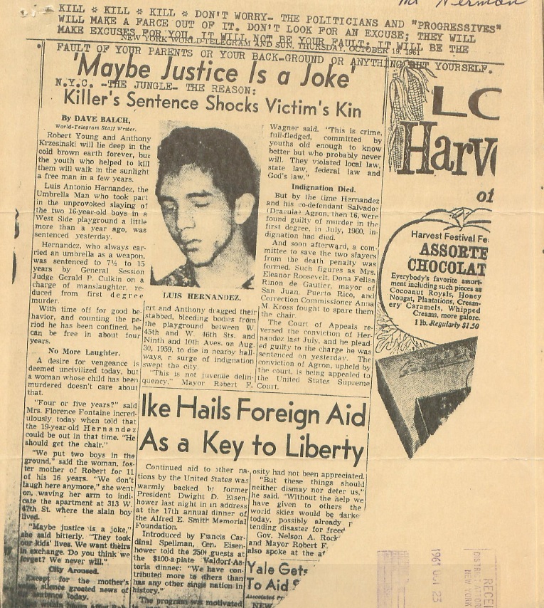 After the two murders in the Hell’s Kitchen Park on the evening of August 30, 1959, Salvador Agron and Louis Hernandez were not apprehended by police right away. They fled to the Bronx where they hid for awhile until they were eventually captured a few days later. During this time, the newspapers had been reporting heavily on the sensational news of the two boys killed in this gang murder. With the arrest of Sal, they had someone to put their sights on even though four other defendants had already been arrested. Sal didn’t disappoint — he was combative with the press and said things that newspaper editors dream about in order to sell more newspapers. For example, Sal was quoted as saying, “I don’t care if I burn, my mother could watch me.”