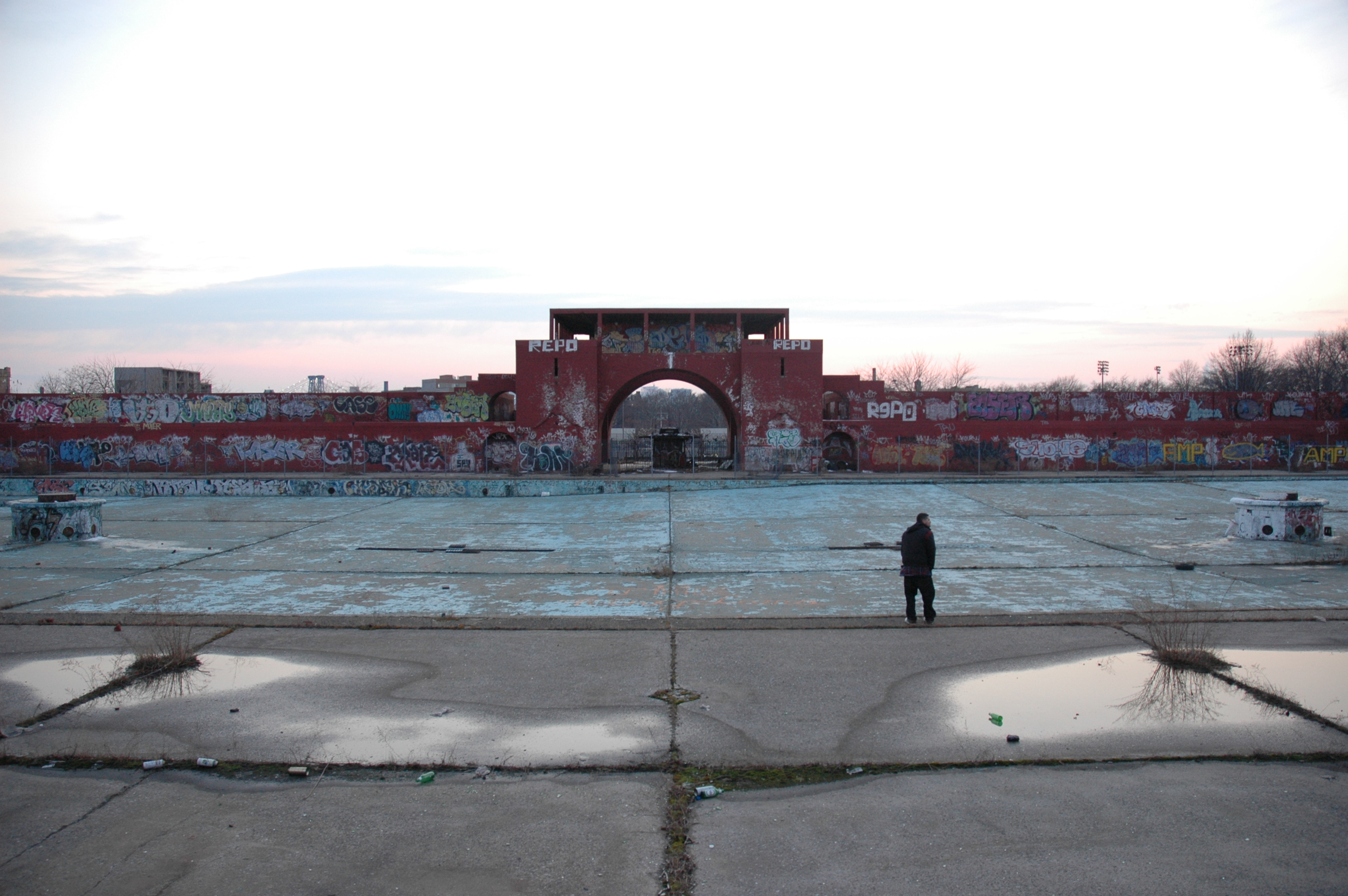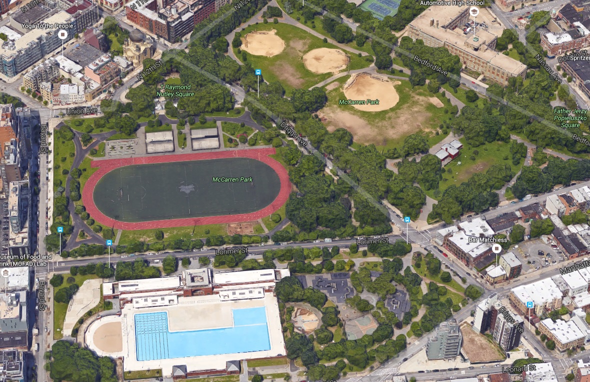 Just as we figured, there is no one in sight, however on the next corner, on Engert Ave and Graham, is a poolroom. One of the guys from the poolroom tells us that he thinks they went to McCarren Park, which is a couple of blocks away. We head down Newton St. and at the next corner there should be a dead end but they’ve torn down one of the houses and you can walk right through the empty lot and cross into McCarren Park. The lot is full of scattered debris, bricks, old plumbing, odd shaped pieces of wood but there’s a clear spot and about ten men are using it as a Bocce Ball court. Bocce is an Italian game that’s a type of lawn bowling. So these two teams of five men each are busy playing Bocce as we walk past them. We walk up the hill of debris that clogs the rest of the lot and go down the other side and into the park. McCarren Park is laid out in three sections. The first (and the one we are crossing into) is the public pool. It’s the biggest pool I’ve ever seen, once when the pool was empty I saw two soft ball games being played in the empty pool at the same time. The second section is for track and field events, it’s an oval track 1/8 of a mile around. In the oval interior of the track is where the field events were held. The third section is just benches for sitting and paths for strolling.