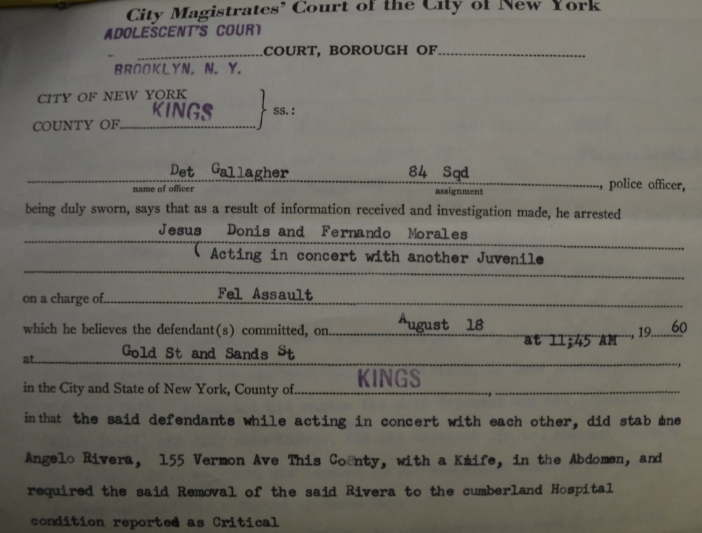 In Brooklyn Rumble (page 315-317), I delved into the history between the Mau Maus and one of the many gangs they fought – the Suicides, a gang from the Farragut Houses. While researching and writing Brooklyn Rumble, I happened to find some court records on an August 1960 assault between the Mau Maus and Suicides. For those who don’t have a copy of the book, here is an excerpt of what I wrote: