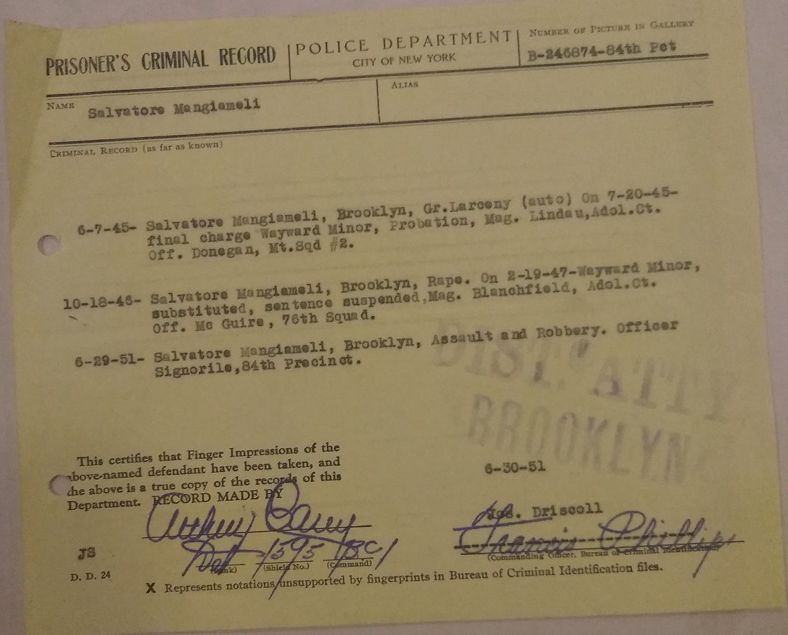 Although my research is mainly on New York City youth gangs from the 1950s, I sometimes come across information about the Mafia. While researching the President Street Boys youth gang from the early 1950s (not to be confused with the adult President Street Boys in the early 1960s written about by Frank Dimatteo), I came across information on Salvatore Mangiamelli and one of his earlier crimes committed in 1951 when he was 22 years old.